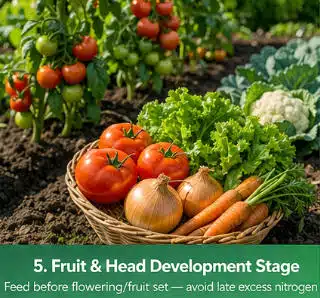 University of California ANR also notes that for cauliflower, for example, a portion of nitrogen goes at planting and the rest is applied in one to three sidedressings before heads begin to form. Applying nitrogen too late can cause quality problems rather than helping yield. That same principle applies broadly to many fruiting and heading vegetables: feed before the main reproductive stage, not after it has already started.