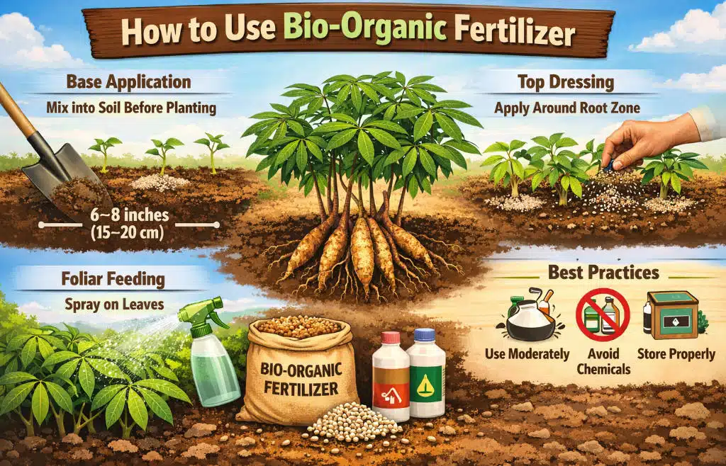 Incorpore o fertilizante bio-orgânico uniformemente nos 15–20 cm (6–8 polegadas) superiores do solo antes da plantação. Isto permite que os micróbios se integrem precocemente, melhorando a estrutura do solo e a disponibilidade de nutrientes desde o início.
